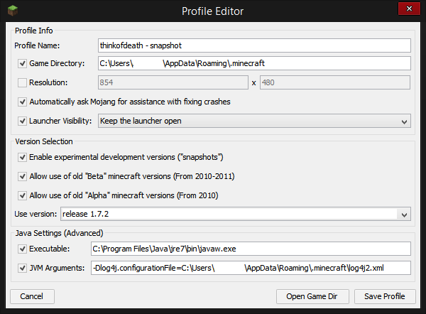 Note that this configuration may not work if you invoke the normal launcher EXE/JAR - instead, use it on the launcher.jar located in %appdata%\.minecraft.